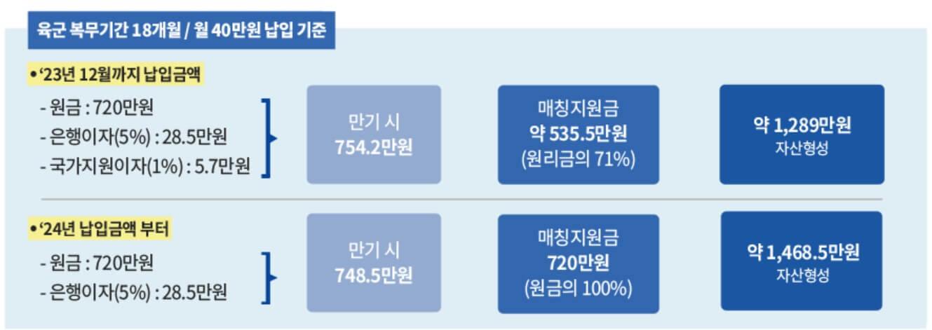 2024년부터 정부지원금은 적금 납입금의 은행이자(5%)에 추가하여 원금의 100%에 해당하는 지원금을 매칭 지원합니다. 단, 정부의 매칭지원금은 복무 후 만기해지하는 병역의무이행자에게 지원됩니다.