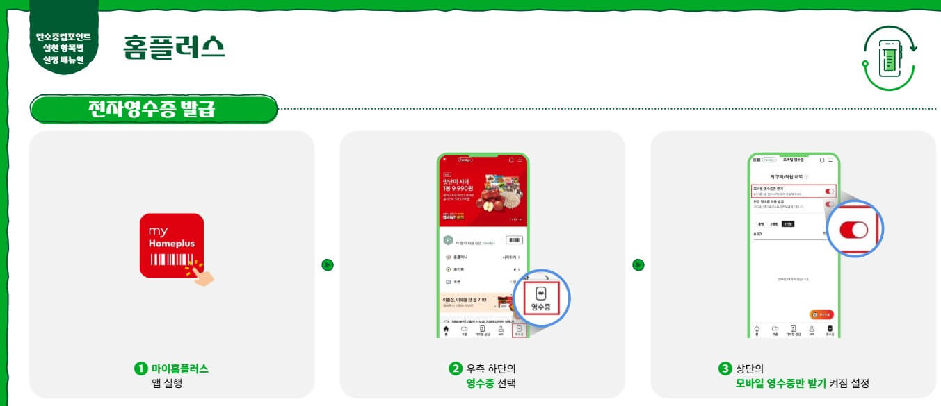 전자영수증을 예로 들면 아래와 같이 해당기업의 앱에 접속하여 전자영수증 발급을 선택해 주면 됩니다. 이마트에서 장보기를 한 후, 영수증을 받지 않고 전자영수증으로 처리했더니 100원의 포인트가 바로 적립되었습니다. 돈 벌기 너무 쉽죠잉!