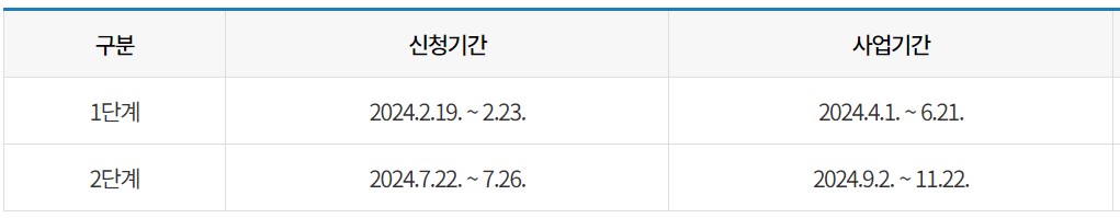 1단계 신청기간은 2.19.(월)부터 2.23.(금)까지 일주일간입니다. 이 기간중에 신청하셔야 4.1.부터 시작되는 1단계 사업기간중에 참여하실 수 있습니다.