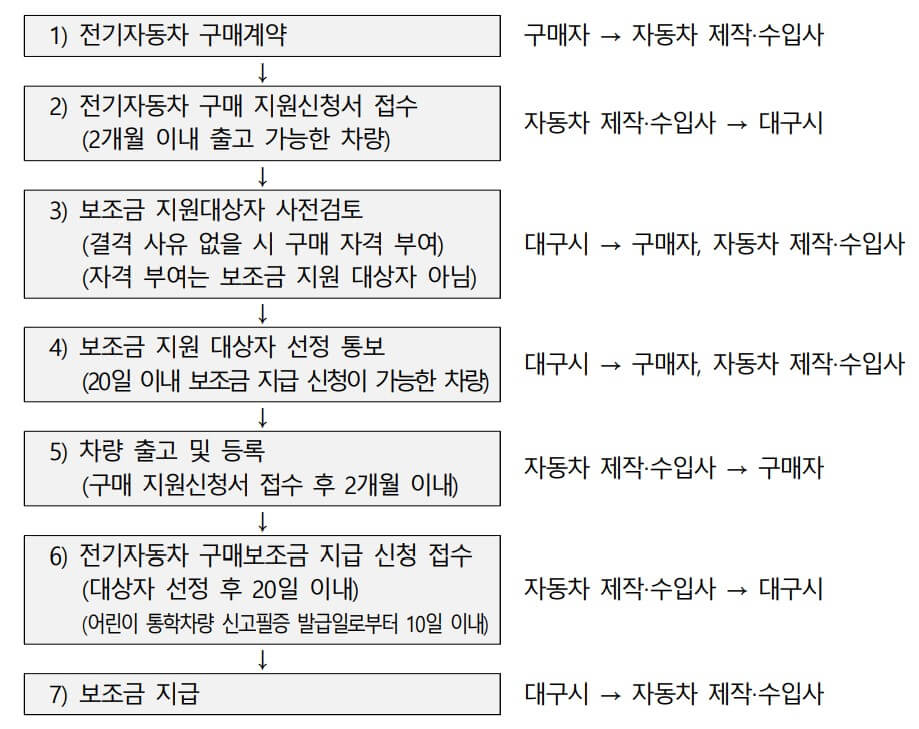 전기차 보조금 신청은 자동차대리점에서 구매계약을 하면 대리점을 통해 신청이 이루어지므로 개인구매자가 직접 행정기관을 찾을 필요가 없습니다. 이후 차량 출고후 등록이 이루어지면 보조금은 자동차회사로 바로 지급되는 절차입니다. 구매자 입장에서는 참 쉽쥬~ 자세한 절차는 아래 내용을 참고하세요!